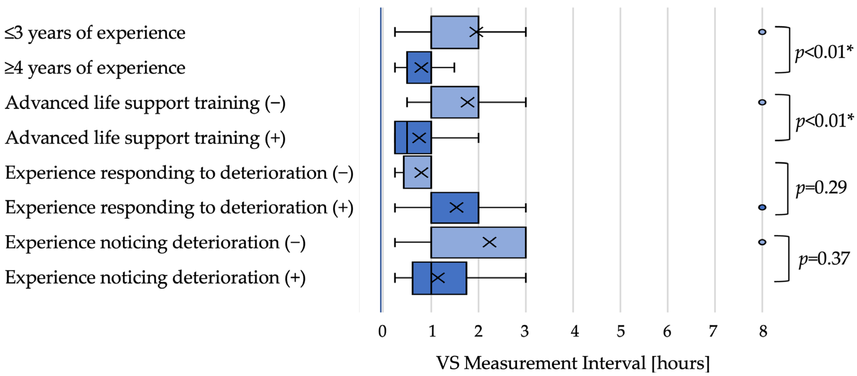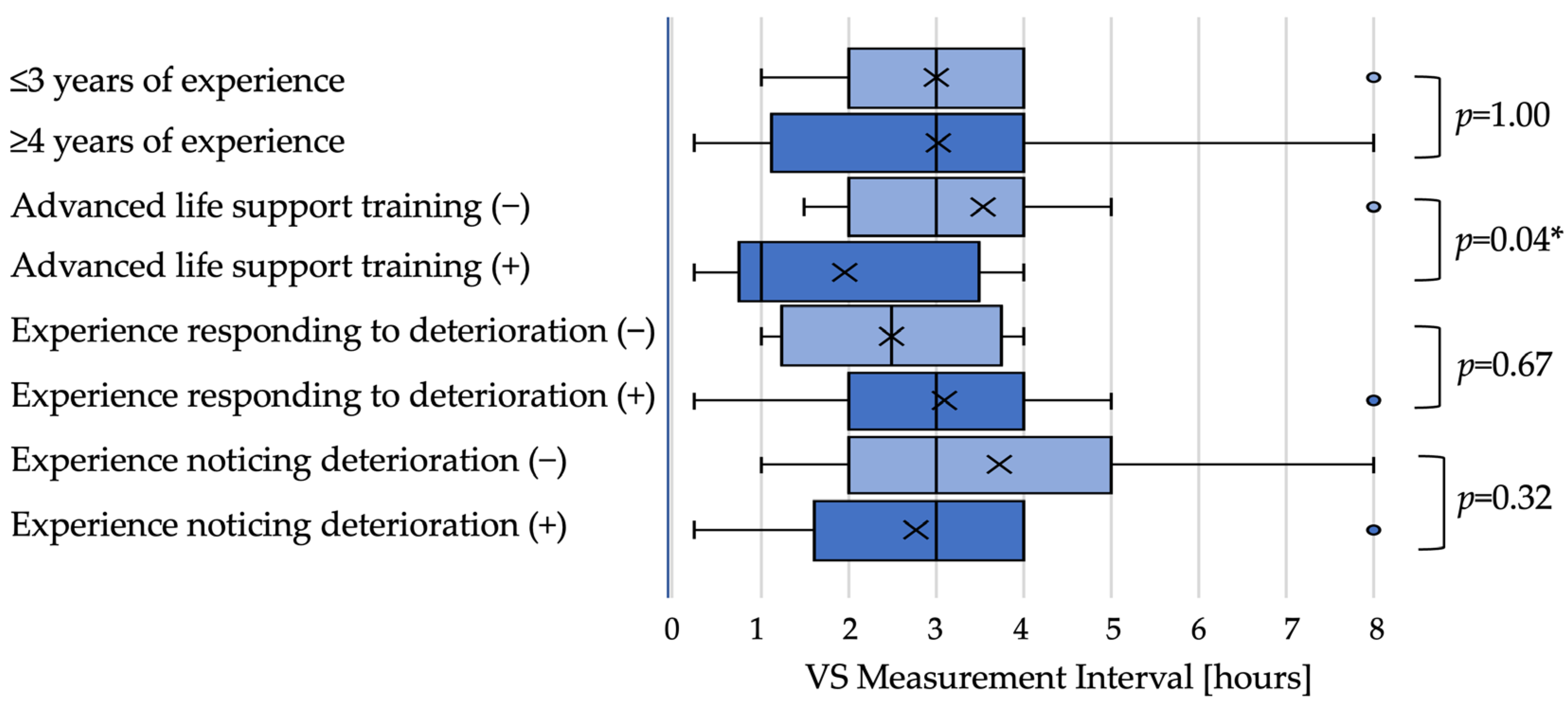 p = 0.04). Intervals did not differ significantly by experience responding to deterioration (2.5 h vs. 3 h;