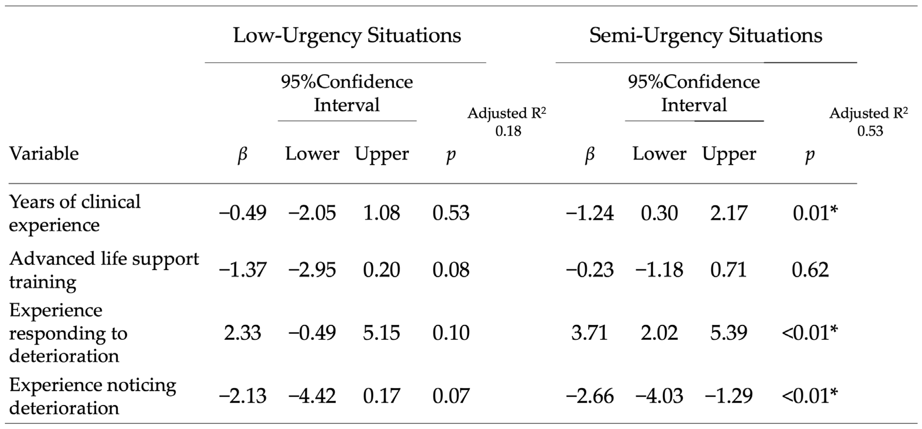 Adjusted analyses: In multiple regression models for the low-urgency scenario, no nurse characteristic was independently associated with the next observation interval. In contrast, in the moderate-risk scenario, years of clinical experience, experience responding to deterioration, and experience recognizing deterioration were independently associated with shorter intervals (all