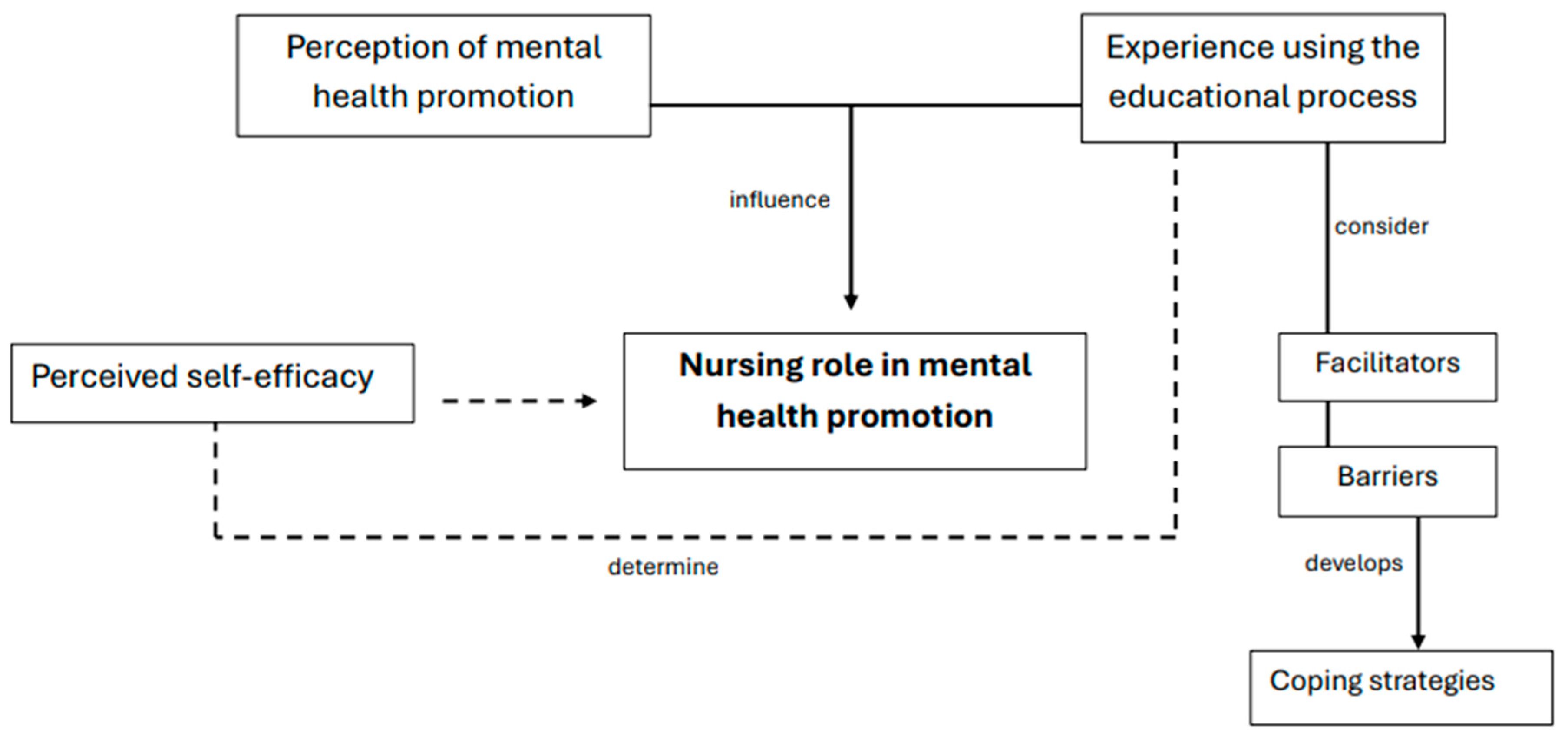 Five main categories emerged from the analysis. The first category, the role of nursing in mental health promotion, describes how students understood their function in the school setting, emphasizing education, support, and the creation of a safe environment for children. The second category, perceptions of promotion as prevention, reflects how participants viewed mental health promotion as an anticipatory strategy aimed at strengthening protective factors in schoolchildren. The third category, use of the educational process, highlights the relevance of pedagogical tools for developing activities, along with the challenges students faced when formulating learning objectives. The fourth category, perceived self-efficacy, captures the initial uncertainty experienced when interacting with children and how this influenced their confidence during the practicum. The fifth category, implementation of the project, brings together students’ reflections during the development of mental health activities, including mixed feelings, perceived facilitators, barriers encountered, and strategies they used to manage these situations.