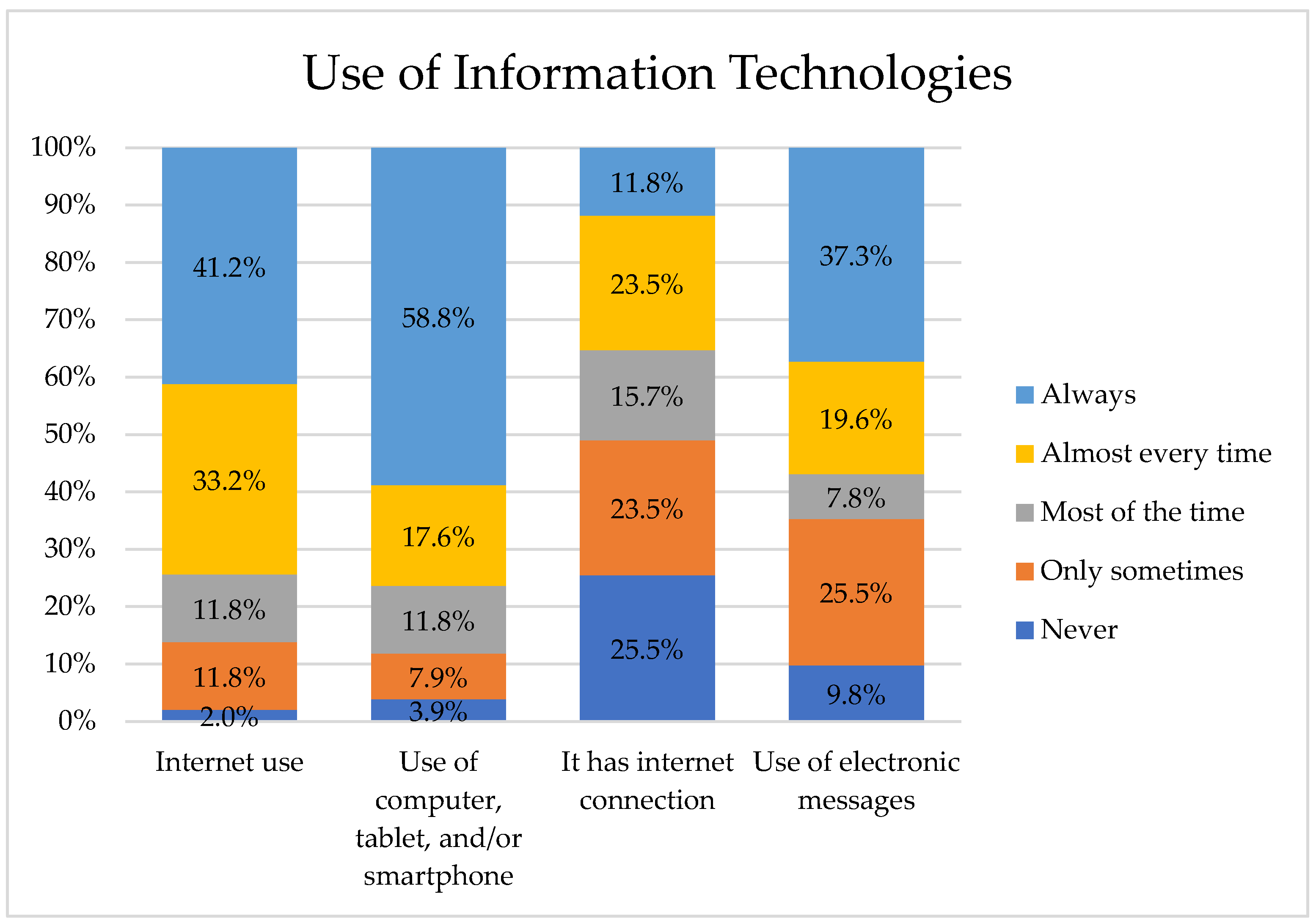 - Cherrez-Ojeda, I.; Vanegas, E.; Felix, M.; Mata, V.L.; Jiménez, F.M.; Sanchez, M.; Simancas-Racines, D.; Cherrez, S.; Gavilanes, A.W.D.; Eschrich, J.; et al. Frequency of Use, Perceptions and Barriers of Information and Communication Technologies Among Latin American Physicians: An Ecuadorian Cross-Sectional Study. J. Multidiscip. Healthc. 2020, 13, 259–269. [Google Scholar] [CrossRef]