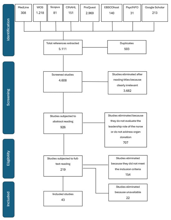 This scoping review was conducted in accordance with the methodology developed by the Joanna Briggs Institute manual for knowledge synthesis [34] and the PRISMA-ScR guidelines [27]. An a priori protocol was defined, which was registered on the Open Science Framework database on 3 December 2023 with the reference osf.io/wzxr3 [35]. The protocol can be found via the following link: https://osf.io/e2wf5. The bibliographic search was performed on the databases MedLine, Web of Science, Scopus, CINAHL, and PsycInfo and on the search engines EBSCOhost, ProQuest, and Google Scholar. The MedLine database was consulted through the Pubmed search engine; the Web Of Science database was consulted through the Clarivate interface; and the Scopus database was queried on the Elsevier interface. The Mendeley Reference Manager software (®2.104.0-x64) was used to manage the studies obtained from the search. Studies published from 1990 to March 2024, from the published and unpublished literature, with any type of research, were included in the review. The search for evidence was limited to 1990 to have a good compromise between a comprehensive review and relevance to the health, social, economic, and cultural context in which health organizations work today. In fact, modern organizations for organ and tissue procurement were established between the late 1980s and the early 1990s [36,37]. The search strings included the following keywords: organ donor; donation; tissue; organ procurement; organ procurement; organ transplantation; organ harvesting; case manager; nurse specialist; nurse coordinator; and advanced nurse. The search was carried out in March 2024. The search queries used in the Medline database are as follows: (((((((organ donor) OR (donation)) OR (tissue and organ donor)) OR (tissue and organ procurement)) OR (organ procurement)) OR (tissue and organ transplantation)) OR (organ transplantation)) OR (tissue and organ harvesting) AND (((case manager) OR (nurse specialist)) OR (nurse coordinator)) OR (advanced nurse) AND ((improving) OR (efforting)) OR (increasing); publication date 1990 to 2024.