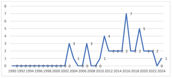 The studies included in the scoping review, as shown in Figure 2, were published in a time range from 2003 to 2023, with a substantial increase in publications starting from 2011; in fact, 81.4% of the selected studies were published from 2011 onwards.