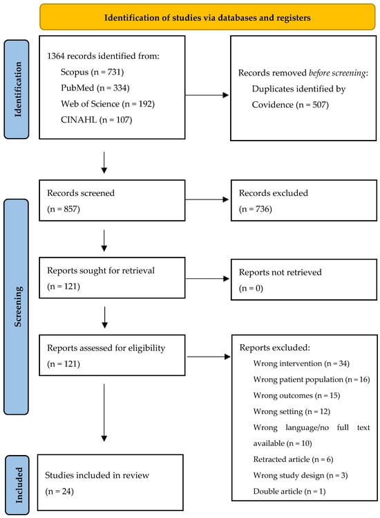 In the initial literature review, 1364 articles were identified. After removing 507 duplicates, 857 articles were screened. Ultimately, 24 articles were included in the systematic review. A PRISMA flow diagram of the included studies is provided (Figure 1). The studies were conducted in different countries, including the USA (8), Belgium (1), Netherlands (1), Italy (1), Israel (2), South Korea (3), Japan (1), Taiwan (1), China (2), Spain (1), and Brazil (2); the country of one study was not specified. Of the included studies, only one had a qualitative design, while the rest were quantitative, primarily observational or retrospective in nature.