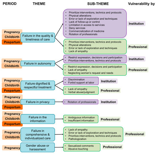 The present data show that difficulties in the quality and timeliness of care had an impact on the perception of OB/GYN vulnerability. This perception was exposed in situations where there was no comprehensive care, was harmed from the incorrect application of techniques or diagnoses and were limitations in access to services. Other authors had linked excessive medicalization and pathologization [33], late and ineffective care [34] and unjustified and painful invasive practices [1,4,35] as actions that violate women’s rights. These actions have been justified by an industrialized model: standardization of processes, fragmentation of mind and body, prioritization of economic stability of health organization and lack of interest in the subjective relationships [13] have been its justifications.