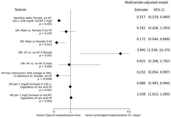 The multivariate model (Table 4, Table S3 model 2) utilized information on sex, HF, LDL-c, and hsCRP, with an additional correction for interaction between sex and HF. The baseline odds for a female individual with no HF and ‘typical’ LDL-c and hsCRP levels (128 mg/dL and 2 mg/L, respectively) were 0.317 (p < 0.001), indicating a 24.07% probability of prolonged in-hospital stay. Regardless of the sex and HF of said individual, the odds increased by 3.80% with every 1 mg/L increase in hsCRP (p = 0.004) and decreased by 1.21% with every 1 mg/dL increase in LDL-c (p < 0.001). Statistical significance of HF and sex depended on the context due to a statistically significant interaction between the two (p = 0.0496). Although the difference between the two sexes was statistically insignificant among non-HF individuals (p = 0.292), men showed approximately 5.81-fold lower odds compared to women if they both suffered from HF (p = 0.011). Moreover the odds were 3.995-fold higher between HF and non-HF female individuals (p < 0.001) but statistically insignificant if both compared individuals were male (p= 0.890). Odds ratios (ORs) and their associated 95% confidence intervals are shown in Figure 1.