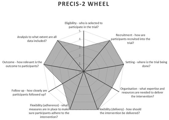 A randomised controlled trial with equal parallel groups was used for intervention allocation. The Pragmatic Explanatory Continuum Indicator Summary-2 (PRECIS-2) [25] was used to ensure the methodology aligned with the principles of pragmatic research. This tool scores the methodology along nine areas, with higher ratings indicating greater focus on pragmatics [25]. These nine areas are study eligibility, recruitment methods, study setting, organisation, flexibility of delivery of care, flexibility of adherence to protocol, follow-up, outcome measures, and analysis methods [25]. The PRECIS-2 wheel for this study is demonstrated in Figure 1.