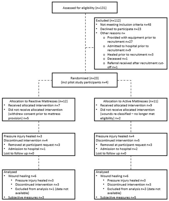 A total of nineteen participants were recruited during this study. Their data were aggregated with participants from an earlier pilot study [45] as the eligibility criteria for the current study extended those of the pilot study, with no changes to the intervention protocol. This resulted in a total of 23 participants across both datasets. Seven participants withdrew prior to receiving their allocated mattresses: two due to their wounds being re-classified and no longer meeting eligibility criteria and five withdrawing consent prior to mattress provision. This resulted in sixteen participants in total, with nine allocated to active mattresses and seven allocated to reactive mattresses (Figure 2). Due to missing photographs, final wound care data were available for twelve participants (active:reactive—6:6). Complete survey data were available for 50% of participants (n = 8, active:reactive—5:3). All participants received and completed the intended treatment. Therefore, Intention to Treat and Per Protocol analyses were identical, with the study protocol and data analysis accommodating participants whose pressure injuries did not heal before their completion of the study.