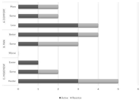 More participants found the active mattresses less comfortable than their usual mattresses compared to the reactive mattress group (Figure 5A). More participants on active mattresses reported improved pain levels than those on reactive mattresses (Figure 5B). Most participants found their allocated mattress challenging to move on or the same as their usual mattress, with only one person finding it easier to move on their allocated active mattress than their usual mattress (Figure 5C).