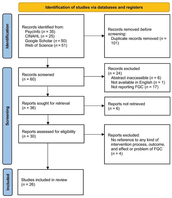 The flow of study identification and selection is shown in Figure 1. The search identified 161 articles: PsycInfo (n = 35); CINAHL (n = 25), Google Scholar (n = 50), and Web of Science (n = 51). After removing 101 duplicate articles, 60 abstracts were screened, and then those papers which were abstract inaccessible (n = 6), not available in English (n = 1), and not reporting FGC (n = 17) were excluded. Thirty full papers were accessed for further evaluation based on the exclusion criteria (no reference to any kind of intervention process, outcome, and effect or problem of FGC), resulting in the final review of 26 full-text articles (43.3% of identified citations).