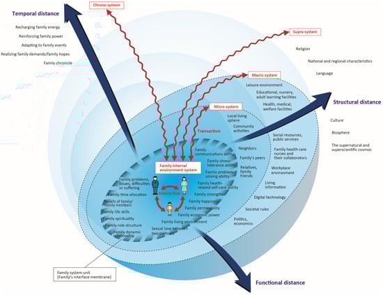SFET is a middle-range family nursing theory that focuses on the family environment which affects the well-being of the family system unit []. In CSFET, the family is considered to be a single unit, but also an interacting system, and the family is treated as a family system unit. The family system unit interacts/transacts with the concentric and spherical family environment that extends inside and outside of it. The family environment is composed of five systems. These systems exist in a three-dimensional logical space formed by three relational axes (structural distance, functional distance, and temporal distance) (Figure 1).