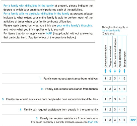 The 21-item IFR is composed of five subscales based on the contents—one supra-system item, four macro-system items, four micro-system items, nine family internal environment system items, and three chrono-system items. In the IFR, the family’s evaluation of each item is evaluated on a five-point Likert scale []. The answer options are “Completely disagree = 1”, “Disagree somewhat = 2”, “Neither agree nor disagree = 3”, “Agree somewhat = 4”, and “Strongly agree = 5”. A five-point Likert scale was used to allow respondents to respond neutrally to each item, and to ensure that they were not obliged to select either a satisfied or dissatisfied position. For items related to work, medical treatment, and children, a column was provided to check INAP (inapplicability). If a family member was not working, did not need to go to the hospital, or did not have children, they were asked to check INAP, and the item was excluded from the scoring.
