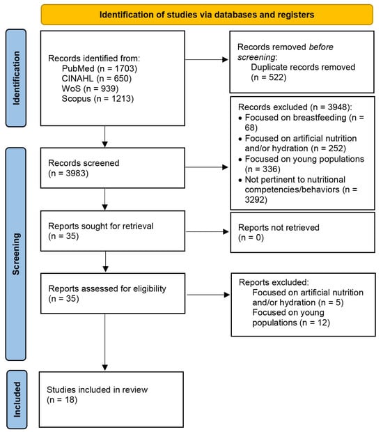 A total of 4505 records were identified across four databases: PubMed (n = 1703), CINAHL (n = 650), WoS (n = 939), and Scopus (n = 1213). After removing 522 duplicate records, 3983 records remained for screening. During the title and abstract screening stage, 3948 records were excluded, including 68 studies focused on breastfeeding, 252 on artificial nutrition and/or hydration, 336 on young populations, and 3292 that were not pertinent to nutritional competencies or behaviors. This resulted in 35 records sought for full-text retrieval, all of which were successfully retrieved. Following full-text eligibility assessment, 17 additional records were excluded, including five focusing on artificial nutrition and/or hydration and 12 focusing on young populations. Ultimately, 18 studies met the inclusion criteria and were included in the review [27,37,38,39,40,41,42,43,44,45,46,47,48,49,50,51,52,53].