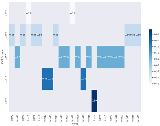 All 24 items of the scale reported CVR higher than or equal to the critical value of 0.444, confirming their relevance. The CVR values ranged from 0.444 to 0.889, with a mean equal to 0.642 (SD = 0.11), as shown in Figure 2.