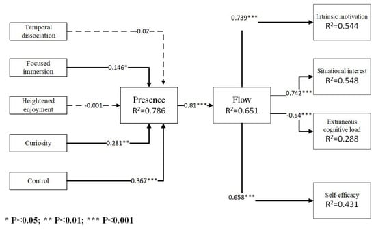 The results indicate that immersion, curiosity, and control all led to significant differences in presence (β = 0.146, t = 2.115, p = 0.035; β = 0.281, t = 2.418, p = 0.006; β = 0.367, t = 5.722, p < 0.001). This indicates that the immersion, curiosity, and level of control elicited by the experiential process of VR resulted in a stronger sense of presence. Therefore, H1b, H1d, and H1e were established. This study did not find a significant effect of temporal dissociation and enjoyment on presence. The above three factors could explain 78.6% of the variance in terms of presence. The presence generated by VR positively affected the flow state (β = 0.81, t = 29.07, p < 0.001); the higher the presence, the more likely it was to produce a flow state. Therefore, H2 is established, and 65.1% of the flow variance could be explained. We also found that the stronger the flow feeling, the stronger the intrinsic motivation, situational interest, and self-efficacy (β = 0.739, t = 16.62, p < 0.001; β = 0.742, t = 19.78, p < 0.001; β = 0.658, t = 14.07, p < 0.001). Furthermore, we found that a flow state can reduce the extraneous cognitive load of individual learning (β = −0.54, t = 9.90, p < 0.001), validating H3, H4, H5, and H6 (see Figure 1).