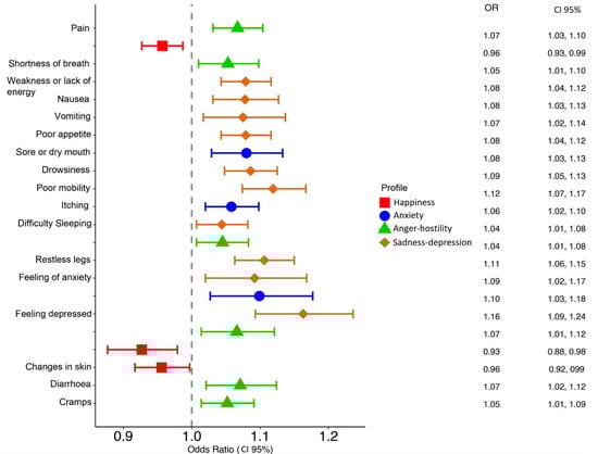 Table 2 details the odds ratios for each symptom in relation to the emotional profiles. Notably, patients with a sadness–depression profile had a higher risk of experiencing negative symptomatology than other profiles, with 10 related symptoms. This relationship affects both their physical and psychological symptomatology. In contrast, the happiness profile showed a protective effect against psychological symptoms and pain.