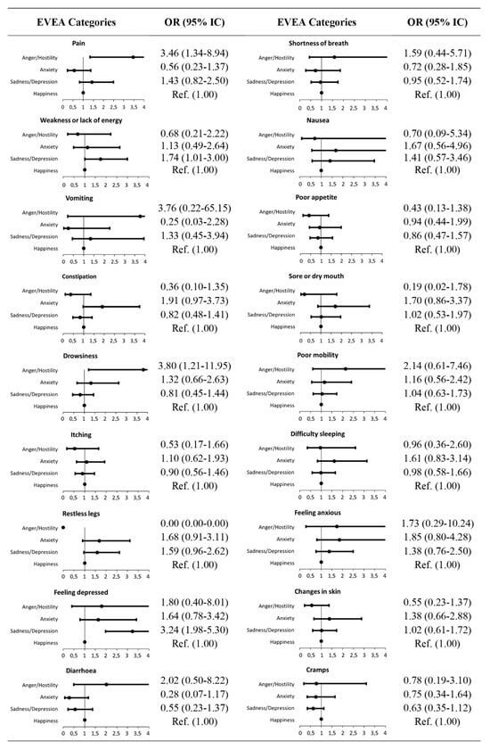 Finally, a logistic regression analysis was performed considering, for each subject, the EVEA category in which they scored the highest in relation to the symptoms they experienced. The results, presented in Figure 3, reveal two statistically significant associations. On the one hand, the sadness–depression profile is related to a higher probability of experiencing weakness or a lack of energy (OR = 1.741; CI 95% 1.01–3.00) and feeling depressed (OR = 3.236; CI 95% 1.98–5.30). On the other hand, the anger–hostility profile shows a significant association with pain (OR = 3.463; CI 95% 1.34–8.94) and difficulty sleeping (OR = 3.796: CI 95% 1.21–11.95), indicating that the presence of this emotional state substantially increases the odds of developing these symptoms.