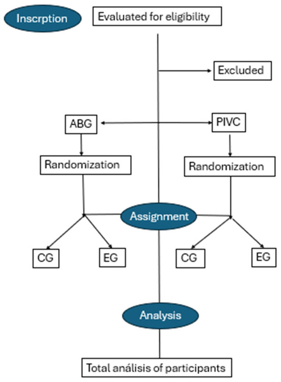 The RCT will collect data derived from the procedures performed on patients selected through probabilistic random sampling. The study workflow is outlined in the following flowchart (Figure 1). Following the CONSORT criteria, after an initial identification of the possible participants in the study, the inclusion and exclusion criteria will be applied, in order to subsequently assign each subject to the relevant group depending on the technique to be performed (PIVC or arterial punctures). Once the technique has been selected, using a randomized system, the subjects will be assigned to the Control or Experimental Groups, and the technique will be performed using the relevant procedure, using the traditional technique for CG and an ultrasound-guided technique for SG. After obtaining the required number of samples, the data obtained shall be analyzed.