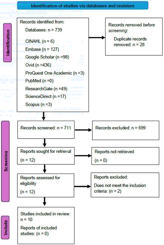 The database searches found 739 studies, of which 28 were duplicates. After checking the remaining 711 studies based on their titles and abstracts, 12 studies were reviewed in full text. Two were excluded as they did not meet the inclusion criteria, and ten studies were included in this review.