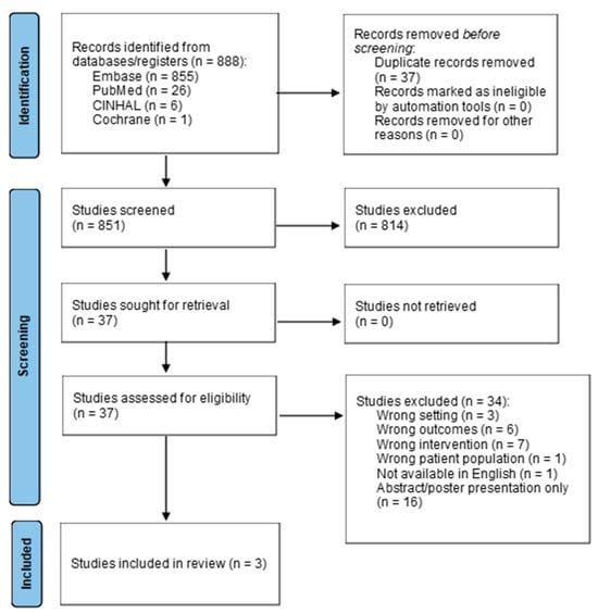 To determine the appropriate interventions, a literature search was performed in October 2024 to evaluate the approaches to discharge coordination and planning for pediatric patients undergoing HSCT using the databases of PubMed, CINAHL, Embase, and Cochrane. Search terms included the MeSH terms “bone marrow transplantation” or “stem cell transplantation” which was combined with “patient discharge” or “hospital to home transition” or “case management.” The results of these two search strategies were combined with a search for the MeSH terms “adolescent” or “child” or “infant”. Related keywords in titles and abstracts and truncations of search terms were included in the search strategies. Filters were applied to limit results to those published within the last 10 years (since 1 January 2014). Eight hundred and eighty-eight articles were discovered from the initial search after the removal of duplicates. Inclusion criteria included peer-reviewed articles published in the past 10 years including a population of pediatric HSCT patients aged 21 or younger, with an intervention regarding discharge care coordination, planning, or education. Articles were excluded if they involved adult or non-HSCT patients, were not related to the first discharge following HSCT admission or related interventions, were not available in English, or were solely an abstract or poster presentation. After preliminary screening, the 34 articles remaining underwent a full-text review, and only three articles were found to meet the inclusion criteria, as outlined in Figure 1. Appraisal of articles was performed via the Johns Hopkins Evidence-Based Practice Evidence Appraisal Tool [].