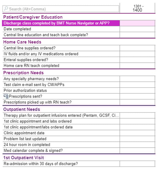 The interventions for this QI project involved a multi-pronged approach with dedicated discharge QI team creation, education standardization, electronic medical record (EMR) integration, mandatory 24 h room-in, and individualized PharmD appointments. First, the multi-disciplinary discharge team was formed consisting of HSCT NPs, MDs, PharmDs, a nurse navigator, and nurse discharge coordinators. The involvement of the HSCT nurse navigator was pivotal in the implementation process as they serve as the standard point of contact for all HSCT patients before, during, and after transplant within this center. Next, center-available educational materials were standardized, to ensure focus on the HSCT process, immunosuppressive medications, diet and lifestyle requirements, and common post-transplant complications (e.g., graft versus host disease, fever in immunocompromised patients, etc.). Additionally, the discharge QI team developed an integrated checklist in the Epic® EMR for all care team members to track the progress of the patient towards discharge (see Figure 2). This provided clarity for members of the multidisciplinary team, as well as allowing the patient and caregiver to accurately monitor their current status and progress towards discharge. A mandatory 24 h room-in for the designated caregiver prior to discharge was also implemented, where the caregiver owned all care and medication administrations towards the end of the hospitalization. The patient and caregiver continued to have a designated bedside RN for all questions and for legal purposes to oversee care and medication administration, as well as to scan all medications administered into the medication administration record (MAR) during the room-in. Due to psychosocial issues related to care of other children and/or work responsibilities by caregivers, some 24 h room-ins required breaking into two 12 h shifts to assure that caregivers could partake in this intervention. Finally, a standardized follow-up appointment was performed with a pharmD near discharge and at the first or second outpatient visit after discharge, where this provider assisted with filling medications into hospital-provided pill boxes and addressed any medication-related questions or adherence concerns. Following hospital discharge, surveys were administered to the primary caregiver.