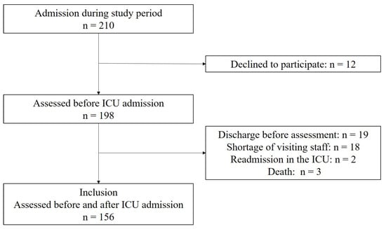 This study included consecutive adult patients (aged ≥ 18 years) who were expected to be admitted to the ICU after undergoing cardiac surgery or procedures, such as valve replacement, coronary artery bypass grafting (CABG), and transcatheter aortic valve implantation (TAVI). Patients who declined participation; cases of insufficient staffing for assessment before or after ICU admission; and patients who could not be assessed because of discharge from the hospital, ICU readmission, or death were excluded.