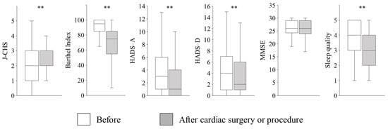 Changes in physical function, cognitive function, mental health, and sleep quality before and after cardiac surgeries and procedures. The J-CHS indicated a worsened status, with the score changing from 2 (1–3) to 3 (2–3) (p < 0.01). The Barthel index indicated a worsened status, with the score changing from 95 (85–100) to 75 (55–85) (p < 0.01). The HADS-A presented improvement, with the score changing from 3 (1–6) to 1 (0–4) (p < 0.01). The HADS-D suggested improvement, with the score changing from 4 (1–7) to 2 (1–6) (p < 0.01). The MMSE score remained unchanged at 26 (24–29) (p = 0.18). Sleep quality deteriorated, with the score changing from 4 (3–5) to 3 (2–4) (p < 0.01). Data were expressed as median (IQR) and analyzed using the Wilcoxon signed-rank test. HADS-A, hospital anxiety and depression scale for anxiety; HADS-D, hospital anxiety and depression for depression; J-CHS, Japanese version of the Cardiovascular Health Study; MMSE, mini-mental state examination. ** Significant at p < 0.01.