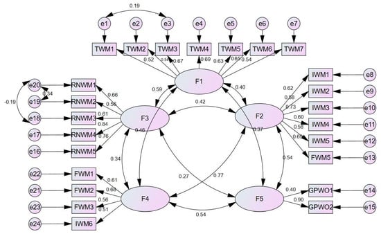In the literature, Cronbach’s α is reported to range between 0.00 and 1.00, with reliability increasing as the value approaches 1.00. Values of 0.50 and above are considered acceptable, while values above 0.70 are desired [26,27]. In this study, the overall Cronbach’s α of the scale was 0.87, with factor-specific Cronbach’s α values being F1 0.80, F2 0.82, F3 0.79, F4 0.66, and F5 0.52. The low number of items in the subdimensions may be the reason for this decrease. In the literature, it is stated that as the number of items in a scale decreases, the Cronbach’s Alpha value may also be lower [33]. Although two factors had values below 0.70, these are still considered acceptable, and the high overall Cronbach’s α indicates strong internal consistency (Table 1). In the original scale, the last two factors also had lower Cronbach’s α values, but the overall Cronbach’s α was found to be 0.84 [17]. These results suggest that the Turkish version of the NWMAS scale is a reliable measurement tool for evaluating nurses’ work methods.