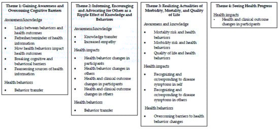 The results of the analysis included four themes using associated codes: “Gaining Awareness and Overcoming Cognitive Barriers”, “Informing, Encouraging, and Advocating for Others are a Ripple Effect of Knowledge and Behaviors”, “Realizing Actualities of Morbidity, Mortality, and Quality of Life”, and “Seeing Health Progress” (Figure 1).