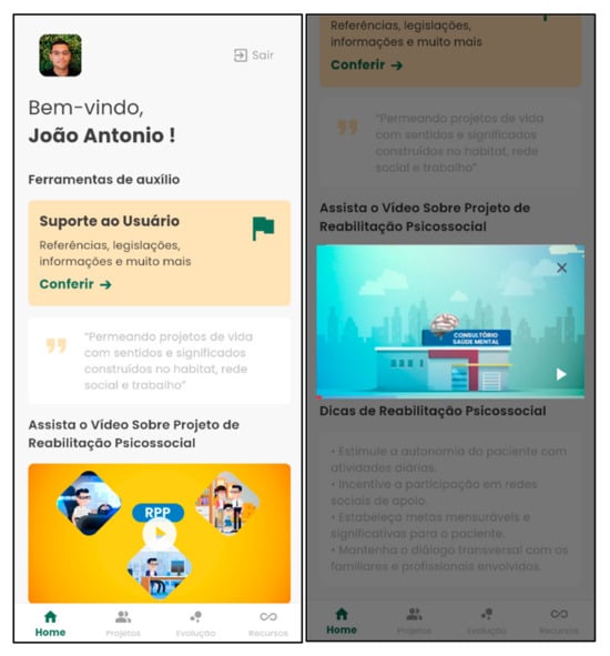 It is important to emphasize that the Psychosocial Rehab App was developed based on a prototype that was previously built and validated in two stages by mental health professionals [13]. The present study aimed to maintain alignment with the original prototype (see Supplementary Data S1—Prototype). However, recognizing the creative leaps inherent to technological design, we incorporated innovations that emerged throughout development, as recommended by design scholars [40].