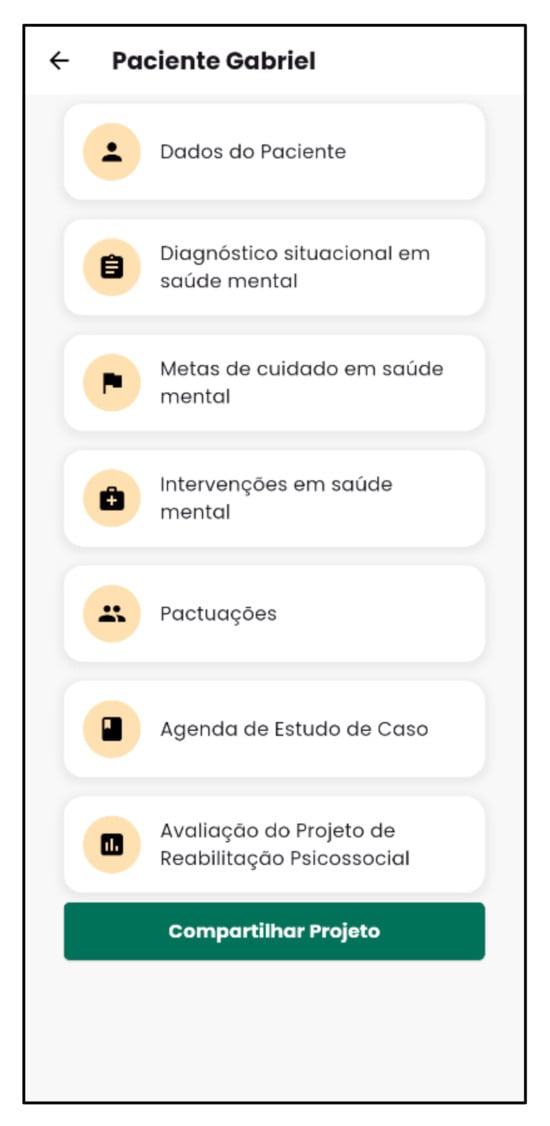 Functions such as “search for mental health services,” “search for the patient/project,” or “add new projects” are crucial to the Psychosocial Rehab App’s purpose of managing the psychosocial rehabilitation project and its dynamism. These functions facilitate the entry and retrieval of clinical histories and access to information about the course of psychosocial rehabilitation projects. They also facilitate communication between mental health professionals and the construction of social networks committed to and responsible for the actions of psychosocial rehabilitation projects [7,21].