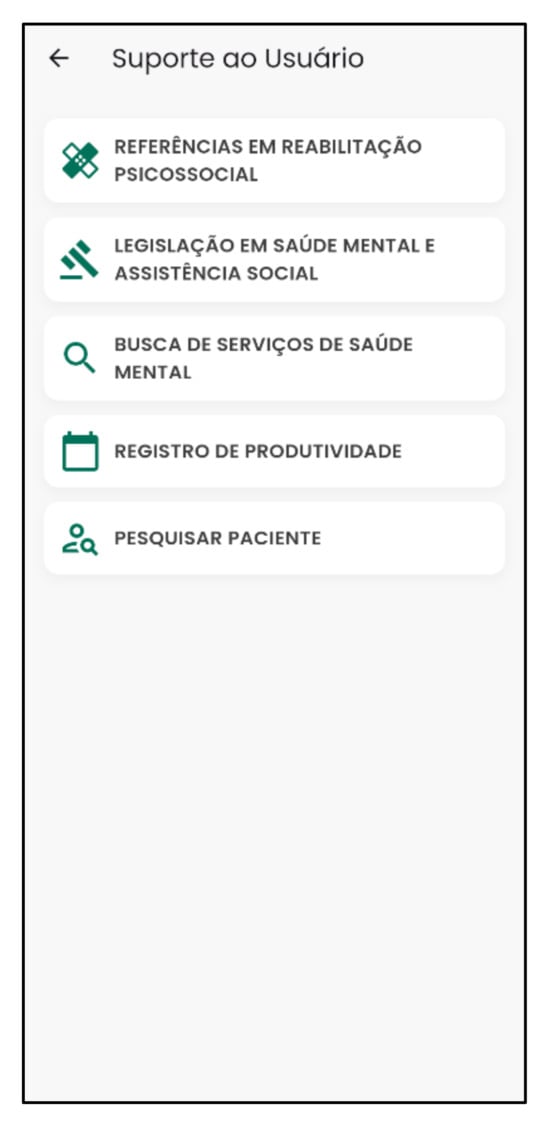 The “Features” command is a crucial tool that assists mental health professionals who use it [58]. It has a strategic “Help and Support” function with tools that help professionals launch their productivity records more dynamically. This is important for adding social value to mental health services [64,65], knowing the main mental health legislation and literature on psychosocial rehabilitation, seeking mental health services, and sharing patient data. These resources are in line with a study showing that resources/tools supporting mental health professionals influence the adoption of mental health apps [63].