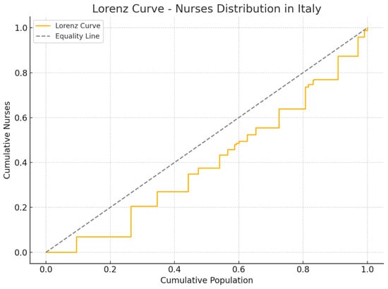 Although the overall Gini coefficient calculated in this study (0.136) may seem relatively low, it still reflects a moderate degree of inequality in the distribution of nursing staff. When compared with international data from OECD countries, where Gini values for health workforce distribution range between 0.10 and 0.18, Italy’s coefficient suggests persistent regional disparities that deserve attention. In a system oriented towards universal healthcare coverage, even small disparities can result in reduced access to care and overburdened professionals in under-resourced areas. Therefore, this value should not be interpreted as evidence of equity, but rather as a signal to reinforce efforts toward more balanced human resource allocation in healthcare.