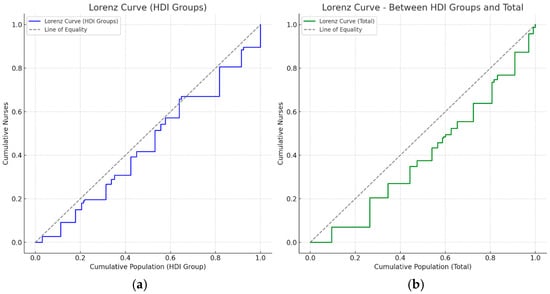 The graphical representation of the Lorenz curves has further clarified the nature of these inequalities. The first graph (a), which groups the regions according to their HDI, shows a nursing distribution that deviates slightly from the ideal line of equity, visually confirming the differences already discussed. The second graph (b), which represents the general cumulative distribution of nurses in relation to the national population, shows a less marked gap, suggesting that, although there are regional inequalities related to the socioeconomic context, the Italian health system still has an overall equal distribution compared to other international contexts.
