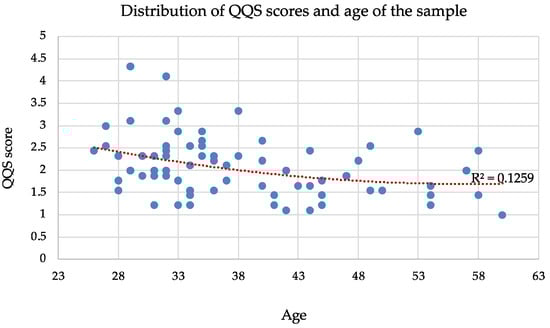 Distribution of QQS scores and age of the sample. Each blue circle represents a single individual in the sample, while the red dotted line indicates the overall trend between age and QQS score across the sample.