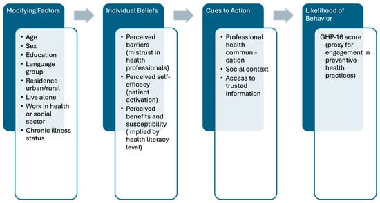 The results of this study can be interpreted using the Health Belief Model (HBM), which conceptualizes preventive health behavior as influenced by the perceived susceptibility and severity of illness, perceived benefits and barriers to action, cues to action, and self-efficacy [11]. In this context, health literacy and patient activation likely reflect enabling constructs, such as perceived control and confidence in managing health, while mistrust in professional health information may act as a barrier to engaging in recommended behaviors. Language group affiliation may serve as a culturally embedded cue to action, shaping exposure to and trust in health messages. Figure 1 illustrates how this study’s variables align with the core domains of the HBM, offering a framework for understanding the observed behavioral patterns in a socio-culturally diverse population.