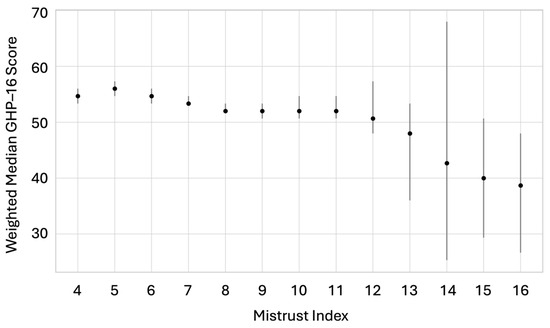 Weighted median GHP-16 score by the level of mistrust in professional health information (n = 2090; weighted). Vertical lines indicate the 95% confidence intervals (CIs) obtained by bootstrapping. Higher index values correspond to greater mistrust in professional health information sources (general practitioners, specialists, pharmacists, and nurses). Spearman’s ρ = −0.20 (p < 0.001).