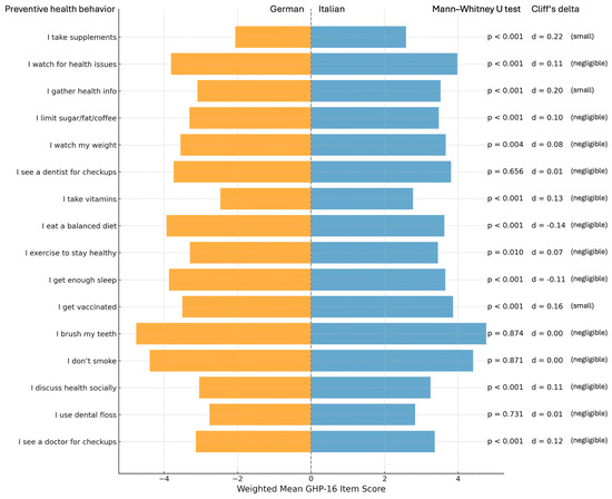 Weighted mean scores for each GHP-16 item, stratified by language group (German Vs. Italian speakers) in South Tyrol. Bars represent mean scores; German-speaking participants are plotted in the negative direction for visual symmetry. Scores range from 1 (never) to 5 (always) and reflect the frequency of engaging in each preventive behavior. For each item, the p-value from the Mann–Whitney U test and Cliff’s delta (d) are displayed to indicate statistical and practical significance, respectively. Interpretation of Cliff’s delta: negligible (d < 0.147), small (d < 0.33), medium (d < 0.474), and large (d ≥ 0.474).