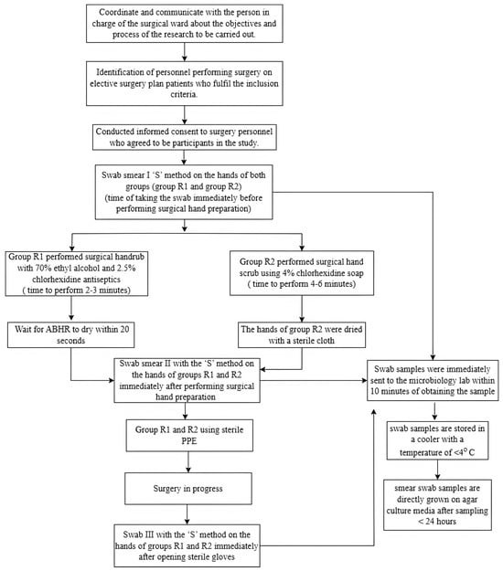 The number of samples in this study will be determined using power analysis with the Wilcoxon–Mann–Whitney statistical test (two groups). Previous research conducted by Martin-Villa et al. resulted in an effect size = 0.63, α = 0.05, and a power (1–β) of 0.80 [22]. The calculation resulted in the minimum number of samples required being 68 (34 samples for each group). During the study, there were a total of 75 hand-swab samples. However, two samples failed to meet the surgical hand rub group criteria because one sample was contacted with non-sterile objects before the hand swab was performed at the end of surgery (post-test 2), and the other sample failed in the second sampling process (post-test 1). In the surgical hand scrub group, one sample failed to meet the criteria because of her hand contact with a non-sterile object before the third-hand swab sampling was conducted.