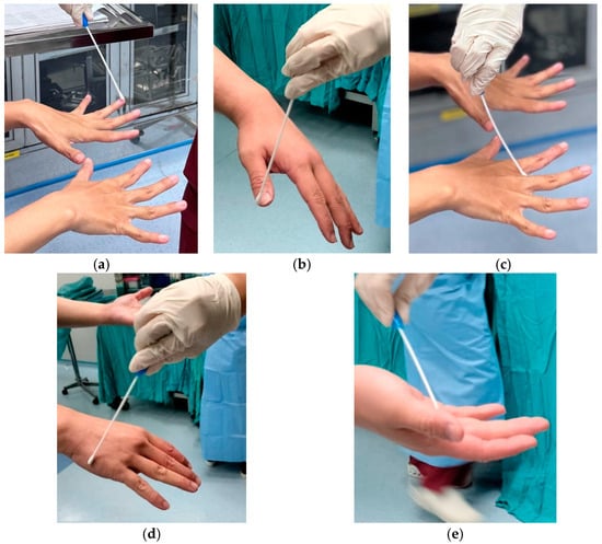 (a,b) Hand swab in all fingertips area; (c) Hand swab in interdigit area; (d) Hand swab in dorsal area; (e) Hand swab in ventral area.