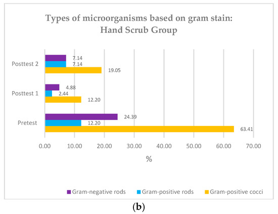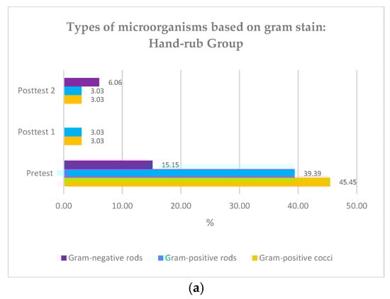 (a) Types of microorganisms based on Gram stain: hand rub group; (b) Types of microorganisms based on Gram stain: hand scrub group.