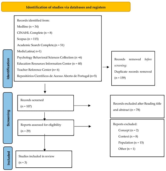 The search strategy followed three steps, as recommended by the JBI methodology. First, an initial exploratory search was conducted in PROSPERO, OSF, MEDLINE (via PubMed), the Cochrane Database of Systematic Reviews, and the JBI Evidence Synthesis to identify relevant keywords and indexing terms. Then, a comprehensive database search was performed using all identified descriptors and keywords. The following databases were searched: MEDLINE (via PubMed), CINAHL Complete, Scopus, Academic Search Complete, MedicLatina, Psychology and Behavioral Sciences Collection, ERIC, and Teacher Reference Center. Finally, a manual search of reference lists from included studies was carried out to identify additional eligible publications.