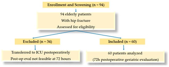 This paper presents only the data collected between 2019 and 2020. It includes an initial group of 94 older patients (>60 years) who had suffered a hip fracture and were scheduled for surgery. Of the 94 patients, we evaluated 60 patients at 72 h postoperatively. This timing may limit the sensitivity of detecting meaningful changes in domains such as nutritional status and cognition, as short-term tools like the MNA are not designed to capture the slower biological and functional changes that occur beyond this early postoperative period. The remaining 34 were not evaluated as their postoperative condition deteriorated, and they were transferred to the Intensive Care Unit due to acute complications frequently observed in frail seniors following hip surgery. These complications included respiratory failure, cardiovascular instability, embolic events, and severe infections leading to sepsis. We acknowledge that this may introduce selection bias, as patients with more severe postoperative complications were not included in the postoperative assessment. This potentially affects the generalizability of the results. Although the baseline characteristics of these patients (e.g., age, comorbidities, and preoperative frailty scores) were comparable to those of the analyzed cohort, the clinical severity of their postoperative complications clearly placed them at higher risk for adverse outcomes (Figure 1).