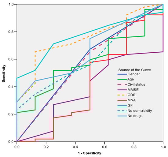 Preoperative scores for the MMSE (p = 0.001, value = 3.78), MNA (p = 0.021, value = 7.72), and GDS (p = 0.046, value = 3.99) were statistically significantly correlated with postoperative mortality. Only the postoperative MMSE score was statistically correlated with mortality (p = 0.026, value = 11.08). The number of medications (p = 0.128, F = 2.36), the number of comorbidities (p = 0.129, F = 2.35) and postoperative psycho-emotional status (p = 0.601, value = 1.87) did not influence mortality (Table S1, Supplementary Materials).