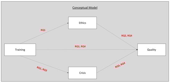 Ethics is connected with quality, because ethical nursing practice is closely related to better patient care and satisfaction (RQ2, RQ4). Also, crisis management is linked to quality (RQ3, RQ4), showing that nurses who handle critical situations effectively can also offer a higher quality of services. At the same time, training is expected to have a direct influence on quality (RQ1, RQ4) but also indirect effects through both ethics and crisis management. This shows that the effect of training is not always direct but may work through these other dimensions.