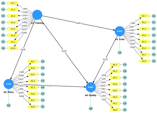 From the training construct, there are direct paths leading to ethics and to crisis management, as well as a direct connection with the quality of care and patient satisfaction. The path from training to ethics reflects the first research question (RQ1) about how much emotional intelligence can be improved through training and if this improvement can help nurses act more ethically and respect patients’ rights (RQ2). At the same time, training is hypothesized to improve crisis management abilities (RQ3), since emotional intelligence skills are important for managing stress and emergencies.