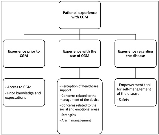 After analyzing the interviews, it was identified that the participants’ experiences and perceptions were related to one of the following themes: experience prior to using CGM, experience during the use of CGM, and experience related to the illness. Figure 1 presents the final summary of themes and subthemes, organized in a hierarchy defined by the level of abstraction. Below, the themes and subthemes are presented, accompanied by quotes from the participants.