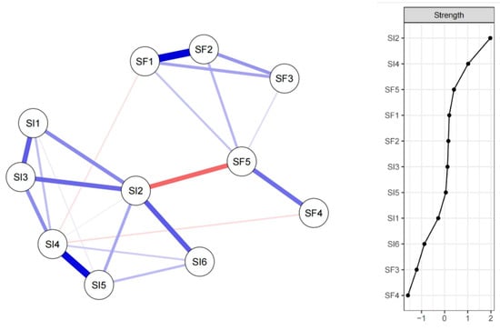 The network analysis identified key relationships between social frailty (SF) and social isolation (SI). Most of the cross-community edges were positive. The edges with the highest edge weights were SF1 “Inability to help others”—SI1 “See face-to-face at least once a month” (edge weight = 1.85), SF2 “Limited social participation”—SI3 “Feel close on a personal level” (edge weight = 0.78), and SF3 “Loneliness”—SI2 “Communicate on a personal level” (edge weight = 0.68). It is worth mentioning that there were 2 negative cross-community edges: SF1 “Inability to help others”—SI2 “Communicate on a personal level” (edge weight = −0.23) and SF2 “Limited social participation”—SI3 “Feel close on a personal level” (edge weight = −0.23). Supplementary Table S1 in the Supplementary Materials provides additional details on the network structure. The analysis revealed that the nodes with the highest Strength values were SI2, SI4, and SF5. These nodes were identified as having the most significant direct influence within the network, indicating their central role in the connectivity structure (see Figure 2).