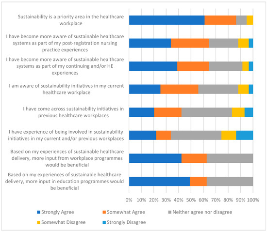 Figure 1 presents students’ perspectives on the role of sustainability in healthcare and education. The majority (86%, n = 52) agreed that sustainability is a priority in healthcare. Over half reported greater awareness of sustainable healthcare systems through post-registration practice (64%, n = 38) and through higher education (64%, n = 38). Awareness of workplace initiatives was higher for current workplaces (56%, n = 33) than for previous workplaces (42%, n = 25). Only 34% (n = 20) reported personal involvement in sustainability initiatives. Nevertheless, 63% (n = 37) believed sustainability initiatives would be beneficial in their workplace. Similarly, 63% (n = 37) agreed that more education on sustainability in healthcare should be integrated into nursing programmes.