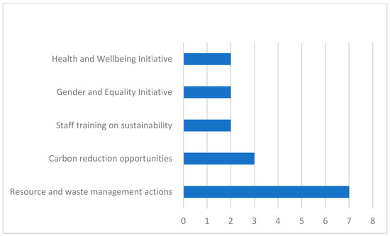 Among the 56% (n = 33) of students aware of initiatives in their current workplace, 16 provided examples (Figure 2). The majority related to resource and waste management (n = 7), such as water-saving mechanisms, waste elimination, and recycling promotion. Other examples included education and awareness activities. For previous workplaces (n = 25), 11 students shared examples: most referred to training initiatives (n = 6), followed by resource/waste management (n = 3) and gender and equality initiatives (n = 2).