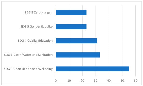 Students chose five out of the seventeen UN SDGs that they felt were priority areas for nursing (see Figure 3). SDG3 Good Health and Wellbeing was reported at a significantly higher rate (93%, n = 55) than all other goals. The remaining top four priority areas identified by nursing students were SDG 2 Zero Hunger (38%, n = 22); SDG 4 Quality Education (53%, n = 31); SDG 5 Gender Equality (39%, n = 23), and SDG 6 Clean Water and Sanitation (56%, n = 33).